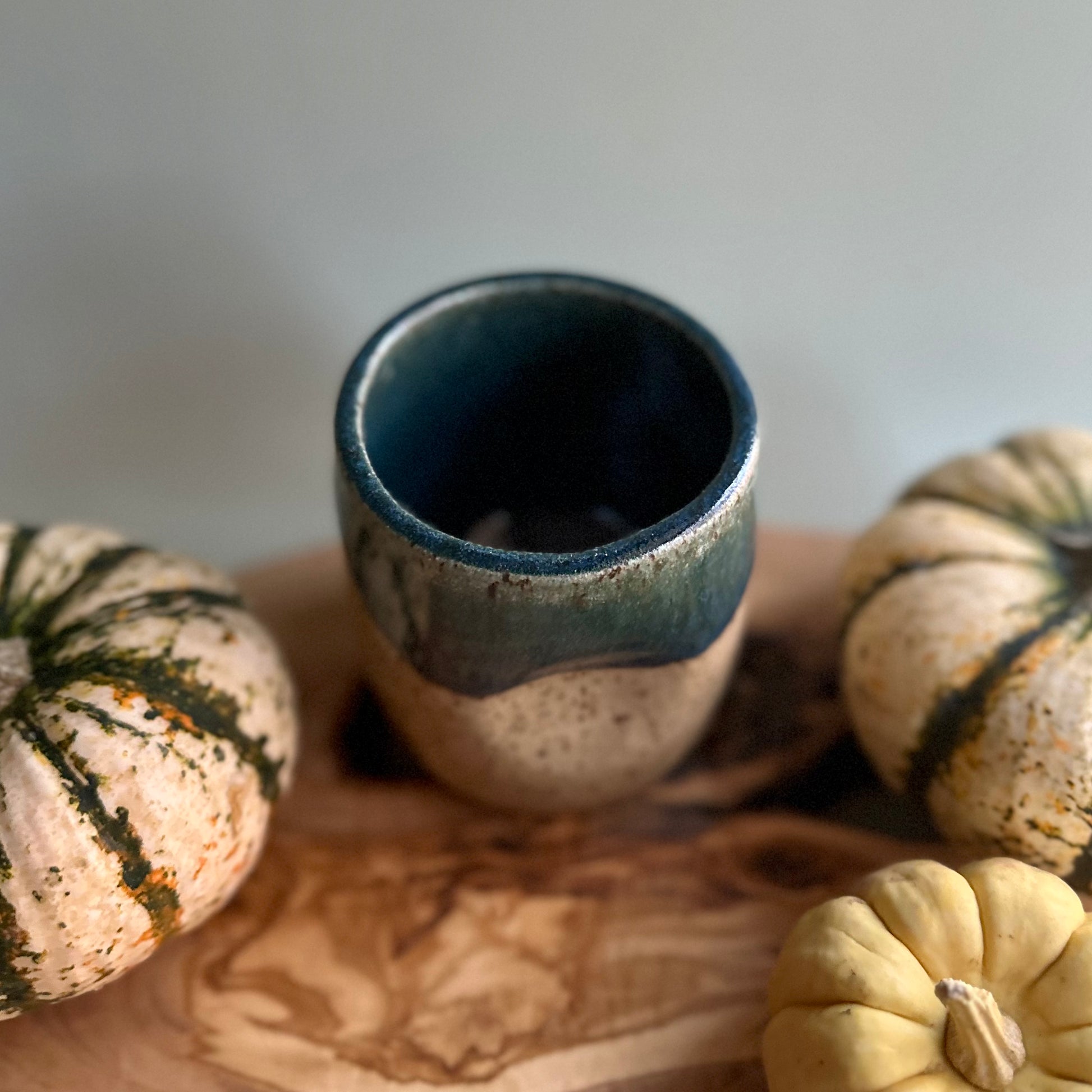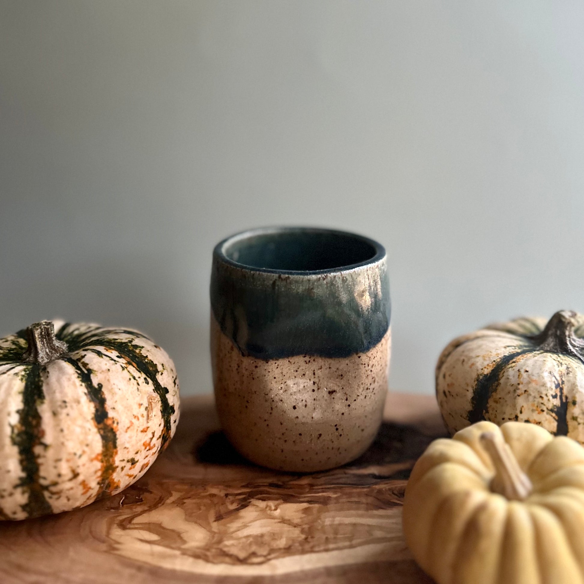 this treeline tumbler was hand-crafted on a potters wheel with a speckle clay body and finished with a decal before being dipped in clear and a rich blue-green glaze.