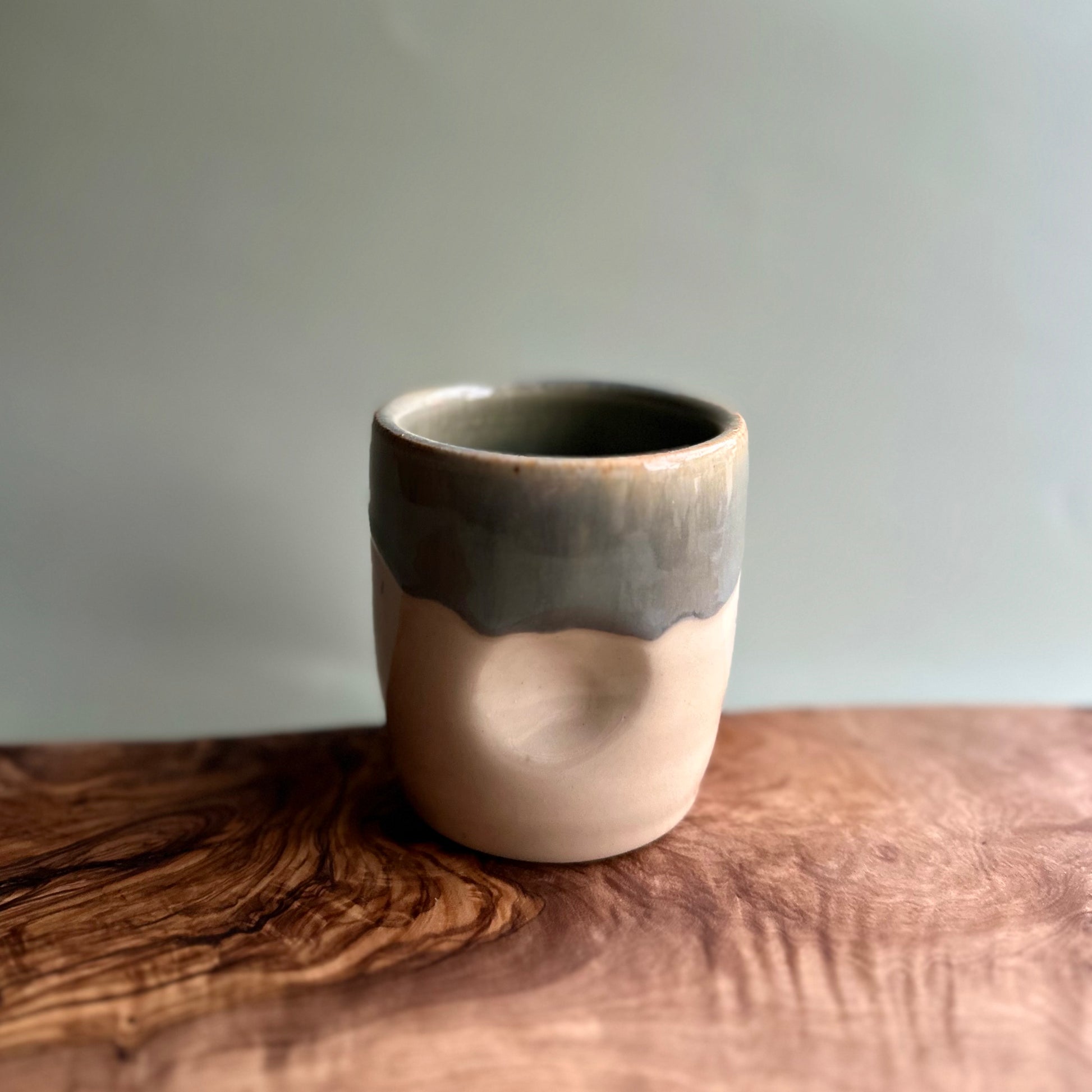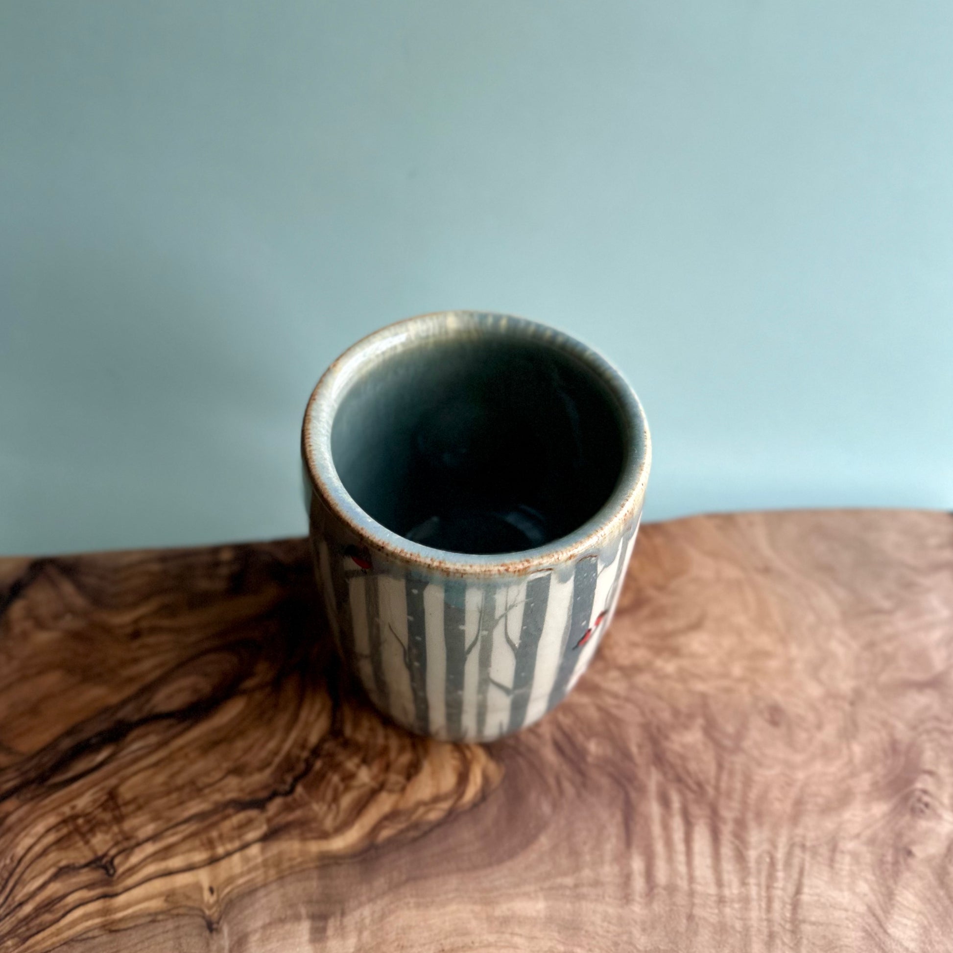 this limited release tumbler with a snowy cardinal decal was hand-crafted on a potters wheel with a speckle white clay body and finished with a lovely blue-brown glaze.