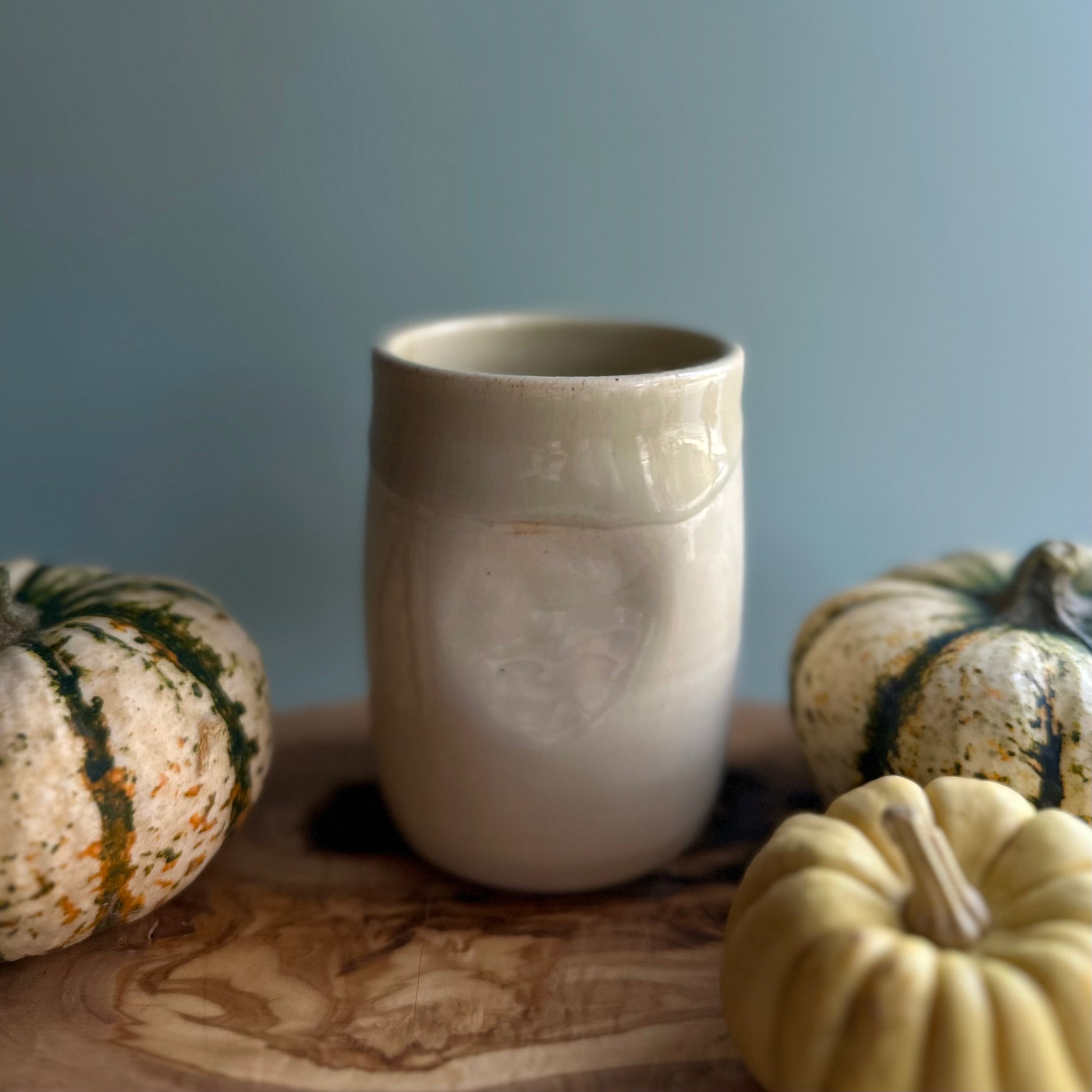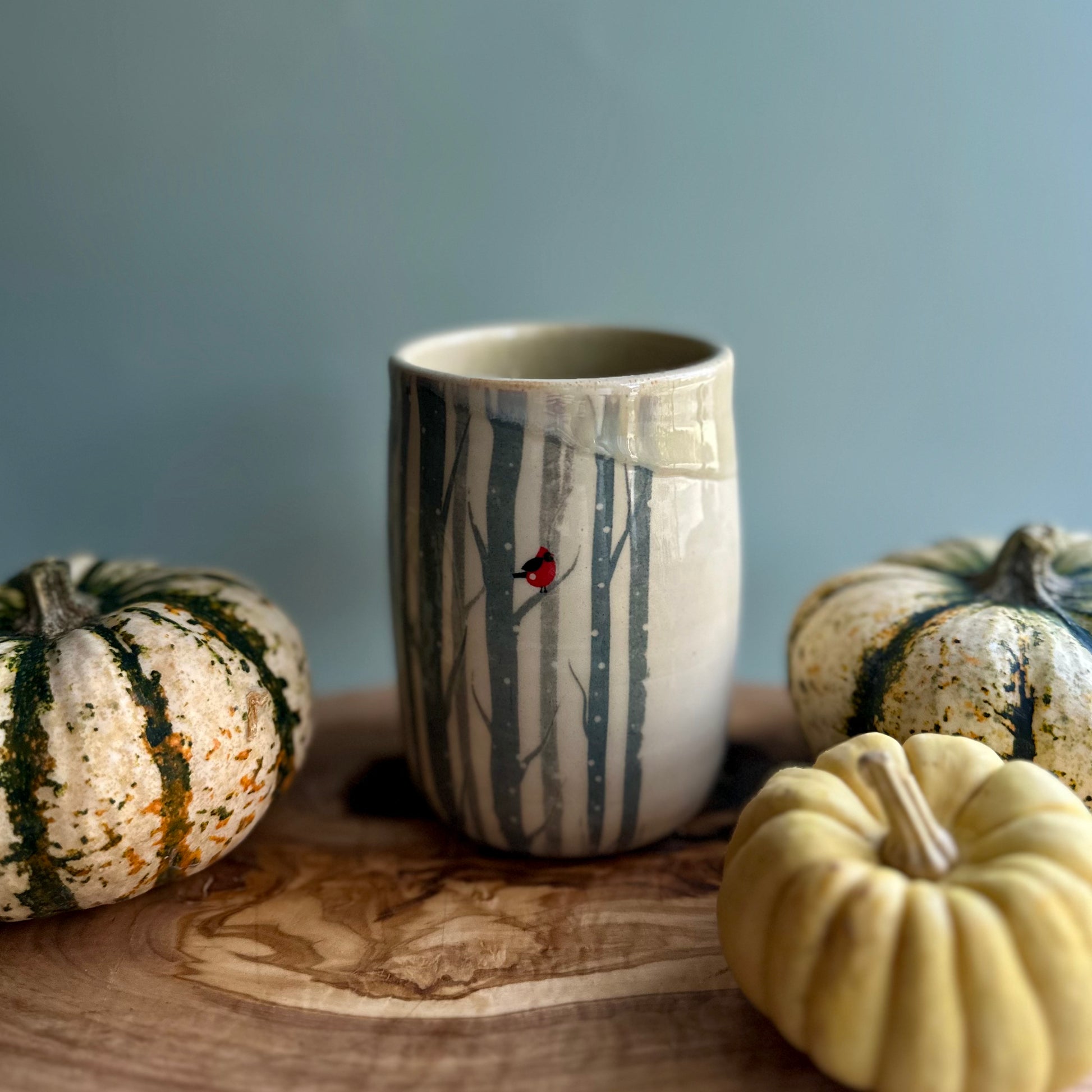this limited release tumbler with a snowy cardinal decal was hand-crafted on a potters wheel with a speckle white clay body and finished with a lovely snowy white glaze.
